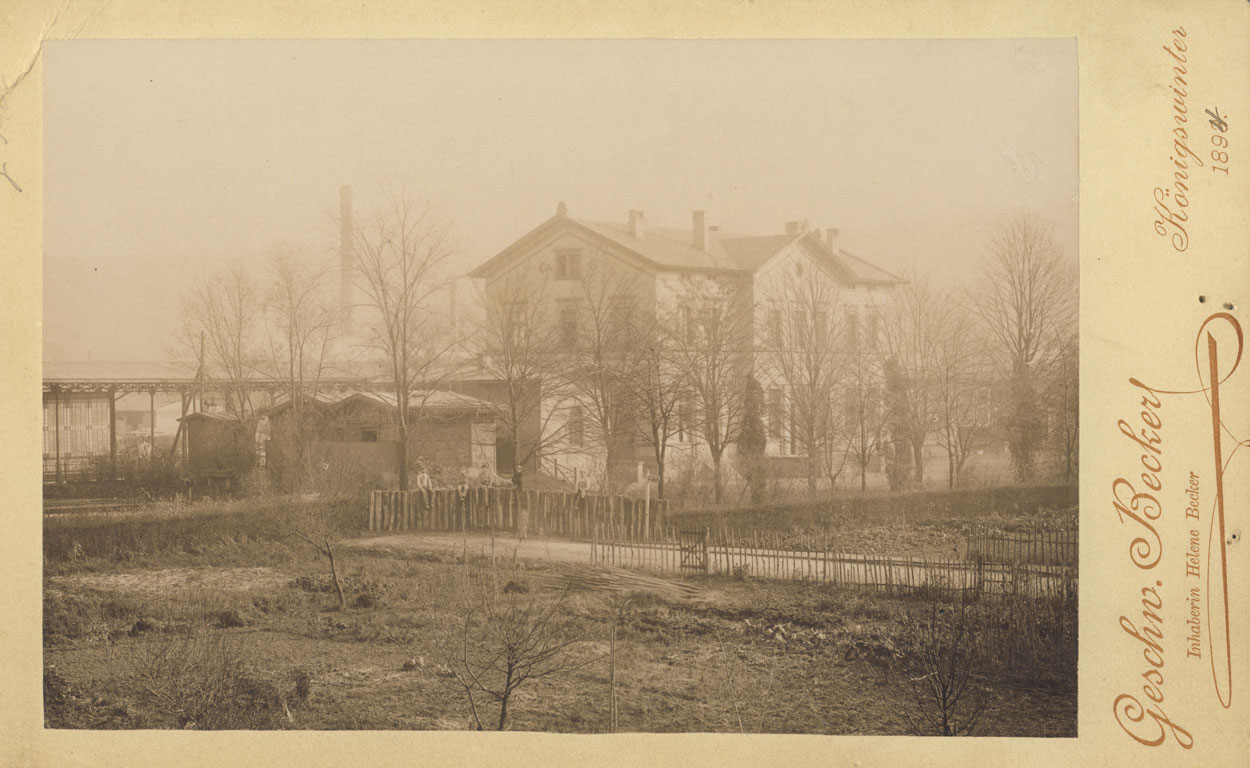 Ein Foto des Bahnhofgebäudes mit Umgebung in Königswinter. Aufgenommen wurde es für Bauarbeiten für die Straßenzufahrt der Kaiser-Str. Der eigentliche Bahnhof hat sich bis heute nur in Details verändert. Die Umgebung dagegen hat sich sehr stark verändert.