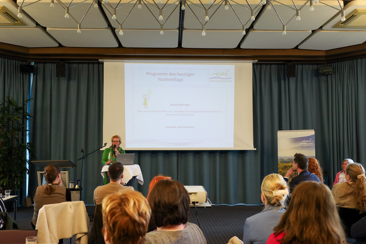 Eröffnet wurde die Veranstaltung durch die Netzwerkkoordinatorin Angela Stang-Schlitt, die für eine engagierte und lebendige Zusammenarbeit im Netzwerk warb. Bürgermeisterin Heike Jüngling unterstrich in ihrem Grußwort die Priorität des Themas für die Stadt: Kinderschutz sei eine gesamtgesellschaftliche Aufgabe von hoher Wichtigkeit und das neue Netzwerk Kinderschutz ein wichtiger Baustein. Im Anschluss skizzierten zwei Vertreter:innen der Hannah-Stiftung gegen sexuelle Gewalt ein geplantes theaterpädagogisches Pilotprojekt für die Kitas der Stadt als einen weiteren wichtigen Präventivbaustein im Kinderschutz in Königswinter.