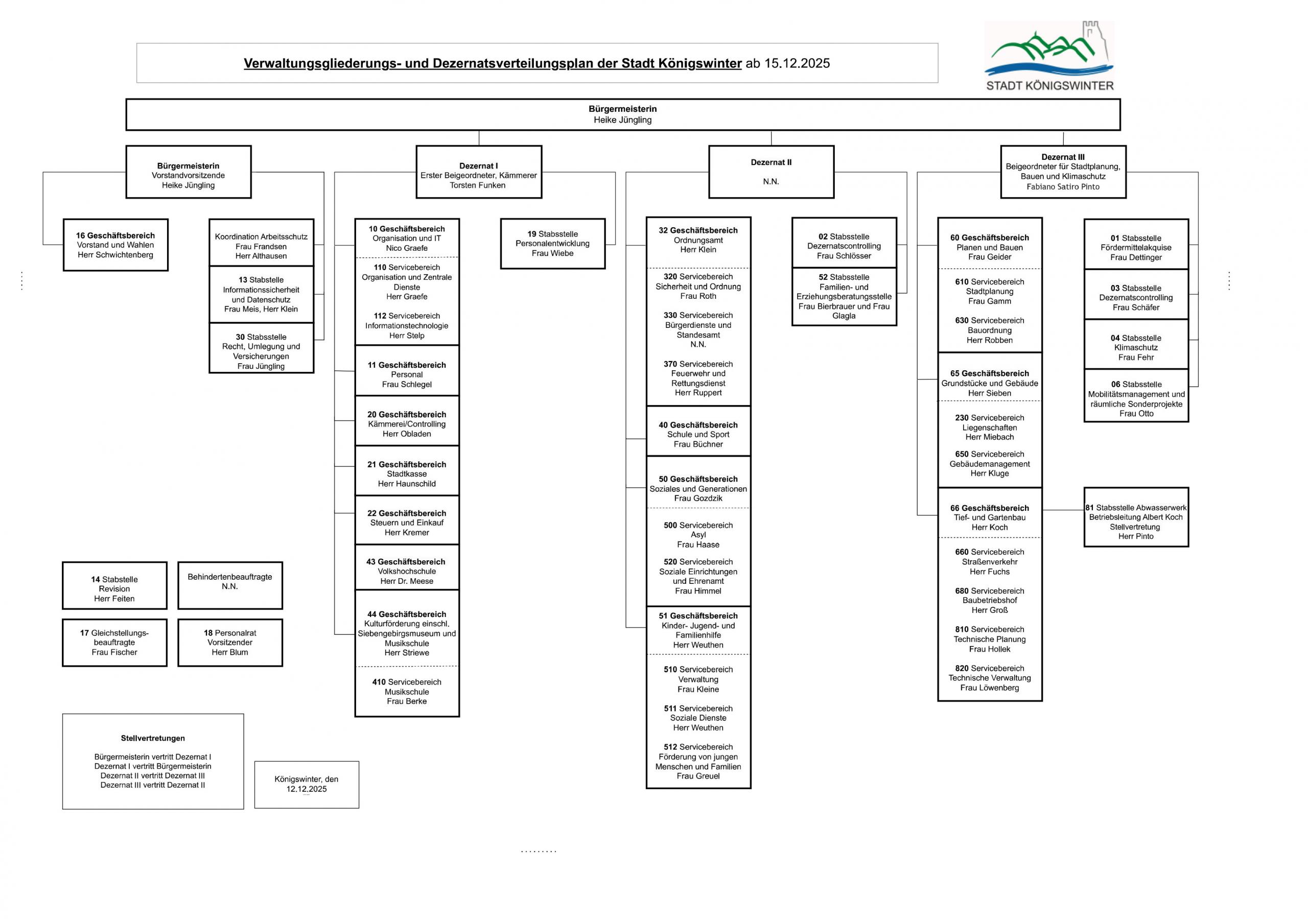 Der Verwaltungsgliederungs- und Dezernatsverteilungsplan stellt die Aufbauorganisation (Organigramm) der Stadtverwaltung Königswinter dar. Die Verwaltung wird durch Bürgermeisterin Heike Jüngling geleitet.