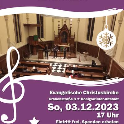 Am Sonntag, den 3. Dezember, lädt die Musikschule der Stadt Königswinter um 17 Uhr zu ihrem Adventskonzert in die Christuskirche in Königswinter-Altstadt, Grabenstraße 8, ein.