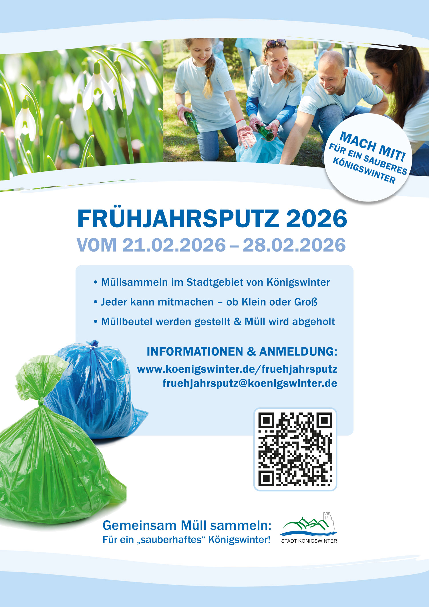 Einen Informationsflyer, das Anmeldeformular, eine Übersicht der Teilnehmenden und alle weiteren Informationen erhalten Interessierte online unter www.koenigswinter.de/fruehjahrsputz oder per Mail unter fruehjahrsputz@koenigswinter.de.