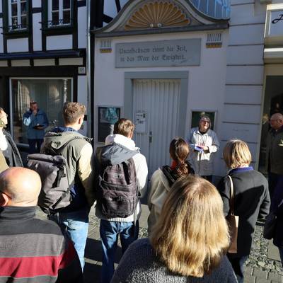 "Geschichte ist besonders gut erfahrbar, wenn sie auf konkrete einzelne Personen bezogen ist und ortsbezogen vermittelt werden kann. Unsere Gesellschaft muss das Bewusstsein für diese Verantwortung gegenüber der Geschichte an künftige Generationen weitertragen. Das kann nur geschehen über eine lebendige Auseinandersetzung mit unserer Vergangenheit," Bürgermeister Lutz Wagner in seiner Ansprach anlässlich der Verlegung der Steine in der Altstadt von Königswinter am 10. November 2022.