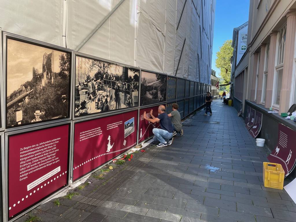 Um diese Situation kreativ zu verbessern hat das Altstadtmanagement die Idee eines temporären Outdoor-Museums entwickelt. Auf dem Bauzaun wird nun während der Bauzeit die spannende 200jährige Tourismusgeschichte der Stadt erzählt. Vom Blick auf das Siebengebirge im Jahre 1850 bis zum illustren Stelldichein auf dem Drachenfels. „Uns war wichtig, bei diesem Projekt nicht nur die Vergangenheit zu zeigen, sondern auch Bezüge zur Gegenwart – wie der Regionalen 2010 und den hieraus hervorgegangenen Projekten - herzustellen“ betont Dr. Andreas Pätz von der WWG. Auf einem Teilstück geht die dekorative Installation auch auf die Geschichte der St. Remigiuskirche ein, die bereits die Altstadt dominierte, bevor die ersten Touristen Königswinter entdeckten.