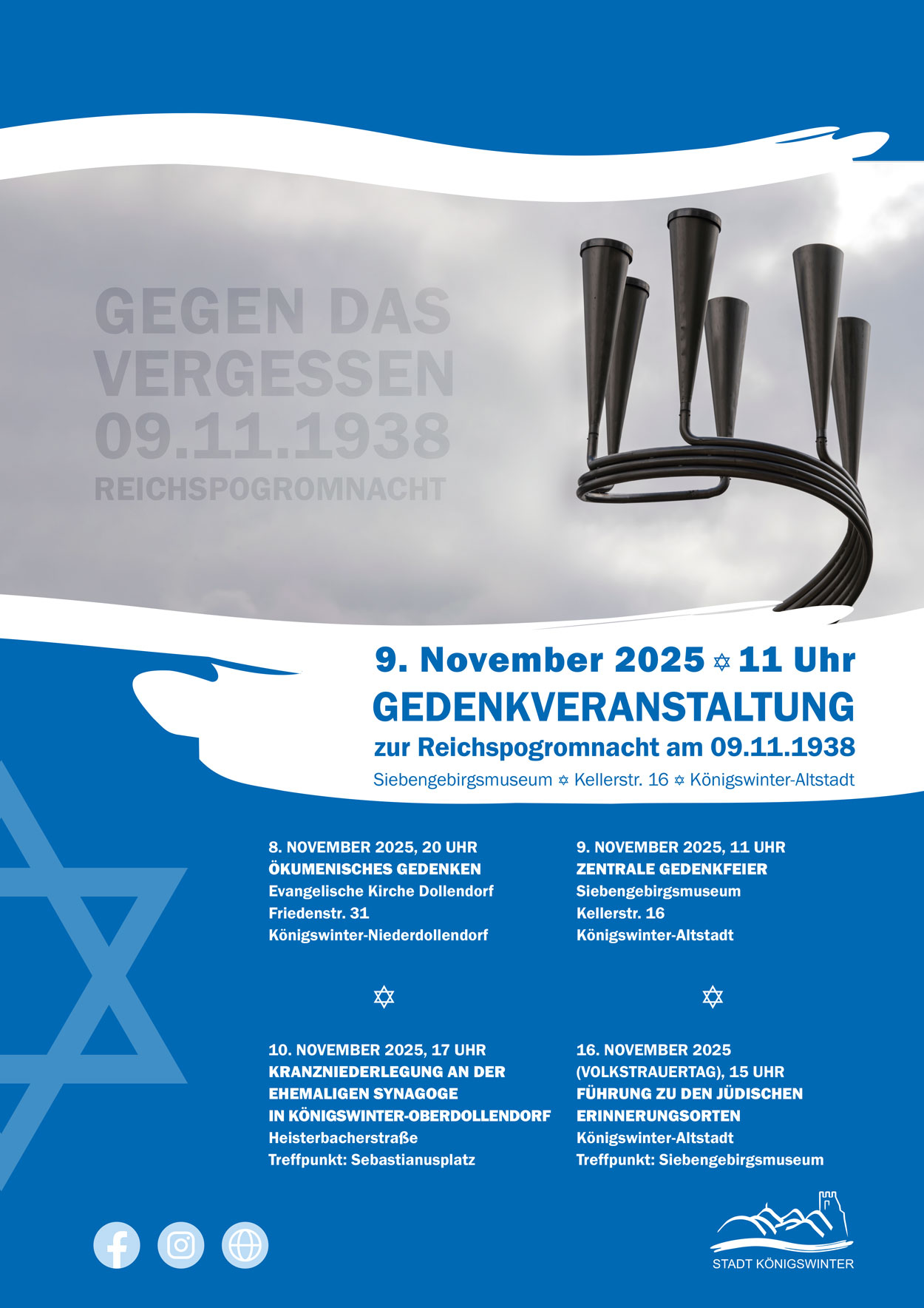Am Vorabend, also am Samstag, den 8. November laden die beiden christlichen Kirchen in Königswinter um 20 Uhr zum ökumenischen Gedenken in die Evangelische Kirche in Dollendorf, in der Friedenstr. 31, ein.