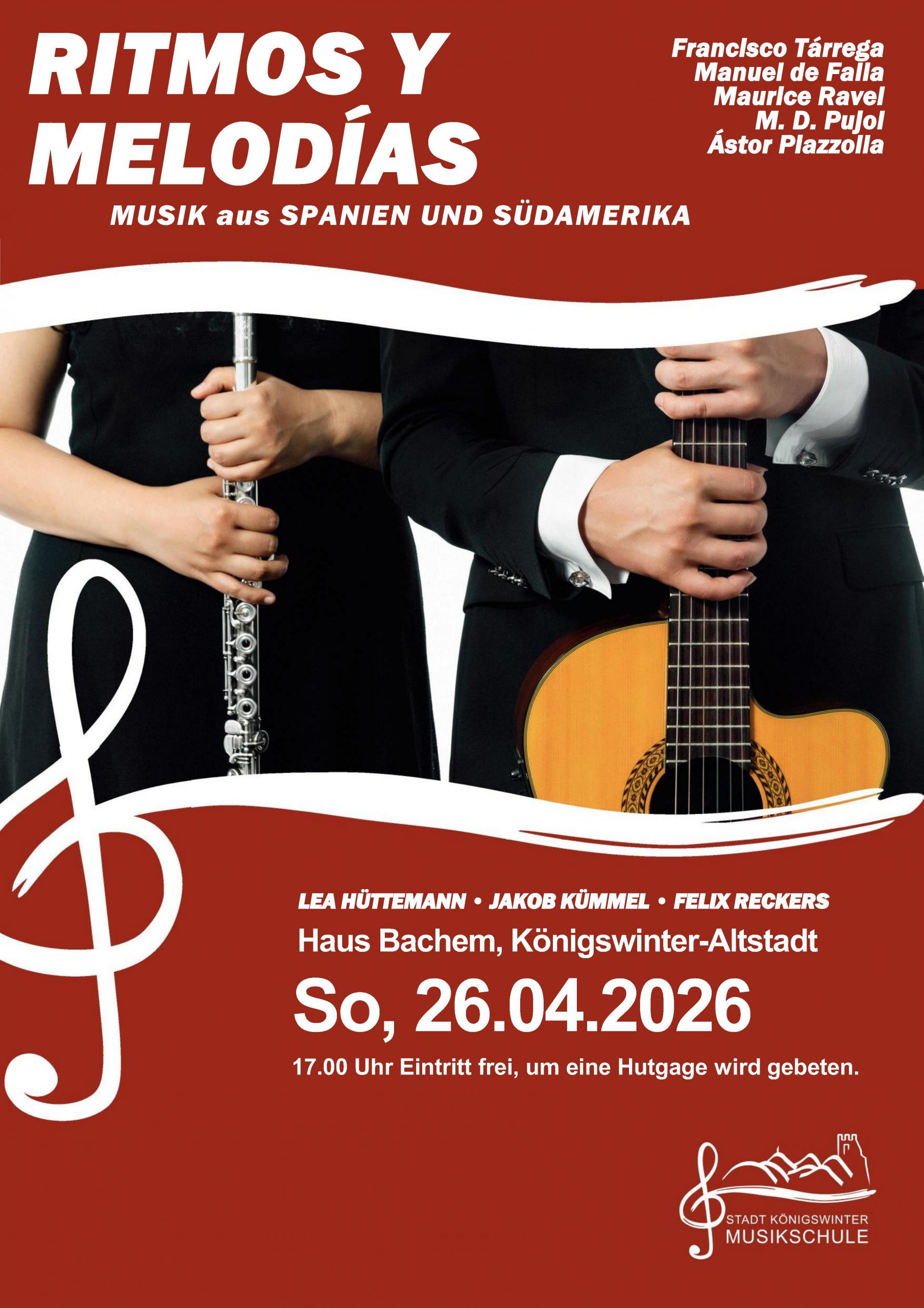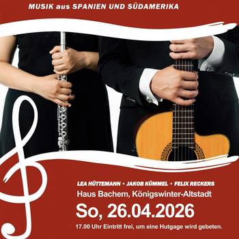 Am Sonntag, den 26. April 2026, wird im Haus Bachem in Königswinter ein außergewöhnliches Konzert zu erleben sein. Um 17 Uhr entführen die Musiker Jakob Kümmel (Gitarre), Felix Reckers (Gitarre) und Lea Hüttemann (Querflöte) ihr Publikum auf eine faszinierende musikalische Reise durch die traditionsreiche und leidenschaftliche Musik Spaniens und Südamerikas.