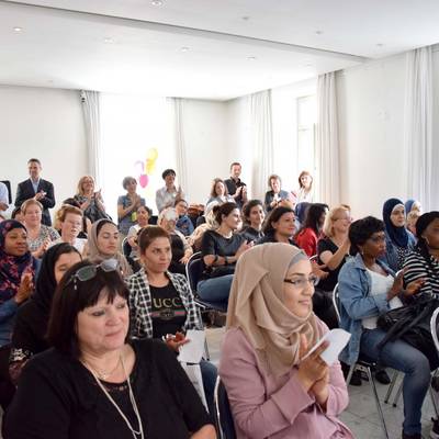 Ganz anders ist es bei Münevver Akgül (35) aus der Türkei. Die Philologin hat ein Diplom in Amerikanistik Sprache & Kultur, einen Abschluss in Pädagogischer Bildung für das Lehramt sowie ein Studium zur Englischlehrerin abgeschlossen. Sie lebt mit ihrem Mann und ihrem kleinen Sohn, der jetzt eingeschult wird, in Königswinter. Seit sie im Dezember 2017 ihren ersten Deutschkurs machen konnte, ist sie mit Ehrgeiz bei der Sache und hat im September 2018 das Sprachniveau C1 erreicht. Sie möchte unbedingt wieder unterrichten. Ihr Weg führt sie über eine Tätigkeit in der Offenen Gesamtschule (OGS) in Königswinter. So gewöhnt sie sich an den Schulalltag und lernt fleißig weiter Umgangssprache und Fachausdrücke, aber auch die Unterrichtsinhalte kennen. „Sie müssen Deutsch lernen, um den Weg zu schaffen. Dann öffnen sich die Türen“, sagt sie den vielen Frauen im Saal voller Nachdruck und Optimismus.