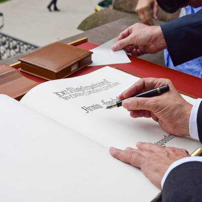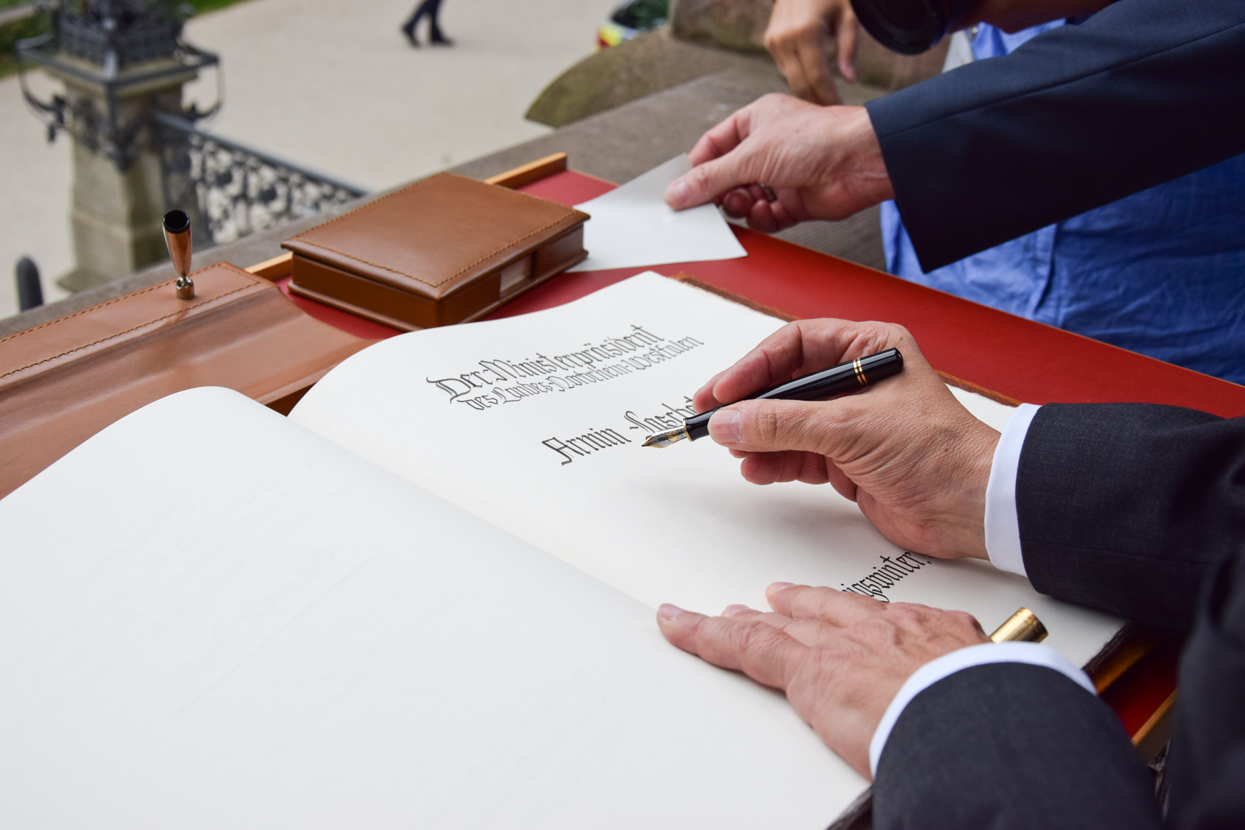 Der Ministerpräsident nutzte die Gelegenheit auf Schloss Drachenburg, um sich in das Goldene Buch der Stadt einzutragen.