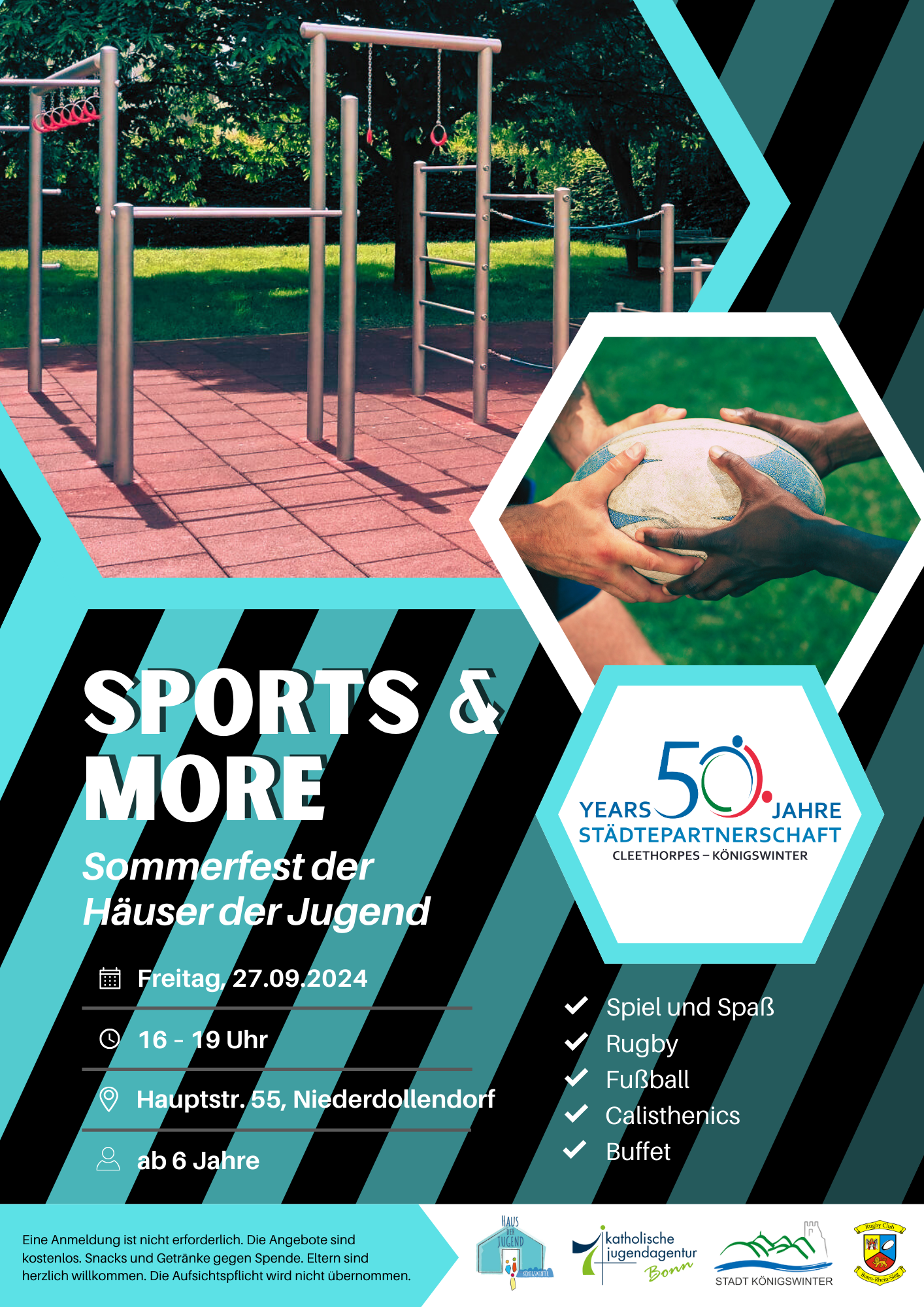 Die Häuser der Jugend laden zum diesjährigen Sommerfest ein. Am Freitag, den 27. September 2024, können sich Besucherinnen und Besucher auf einen Nachmittag am Haus der Jugend in Niederdollendorf in der Hauptstr. 55 voller Spaß, Spiele und Gemeinschaft freuen. Von 16 bis 19 Uhr erwartet die Gäste ein abwechslungsreiches Programm mit Rugby, Fußball und an der Calisthenics-Anlage sowie weiteren Aktionen für Menschen ab 6 Jahren.