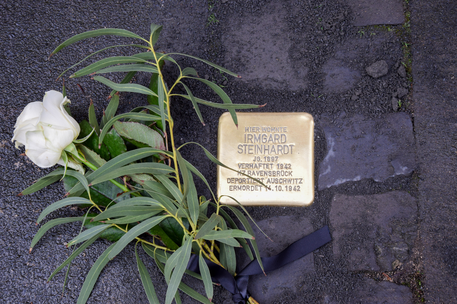 Irmgard Stefanie Steinhardt, geboren 1897 in Koblenz, lebte seit 1934 mit ihrer Tochter in Königswinter. Trotz ihrer Taufe blieb sie nach den nationalsozialistischen Rassegesetzen als Jüdin verfolgt. 1942 wurde sie über verschiedene Stationen deportiert und im Vernichtungslager Auschwitz ermordet. Das Schicksal ihrer Tochter ist bis heute ungeklärt.