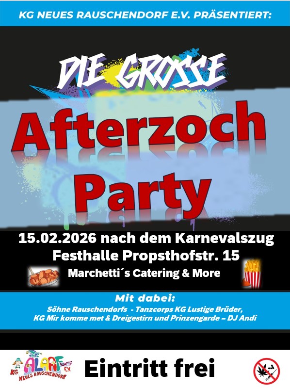 Zur Afterzochparty haben wir in diesem Jahr ein kleines Bühnenprogramm. Einige Tanzcorps zeigen Ihre Tänze, einige Karnevalsvereine zeigen Ihre Tollitäten und die Söhne Rauschendorfs singen.