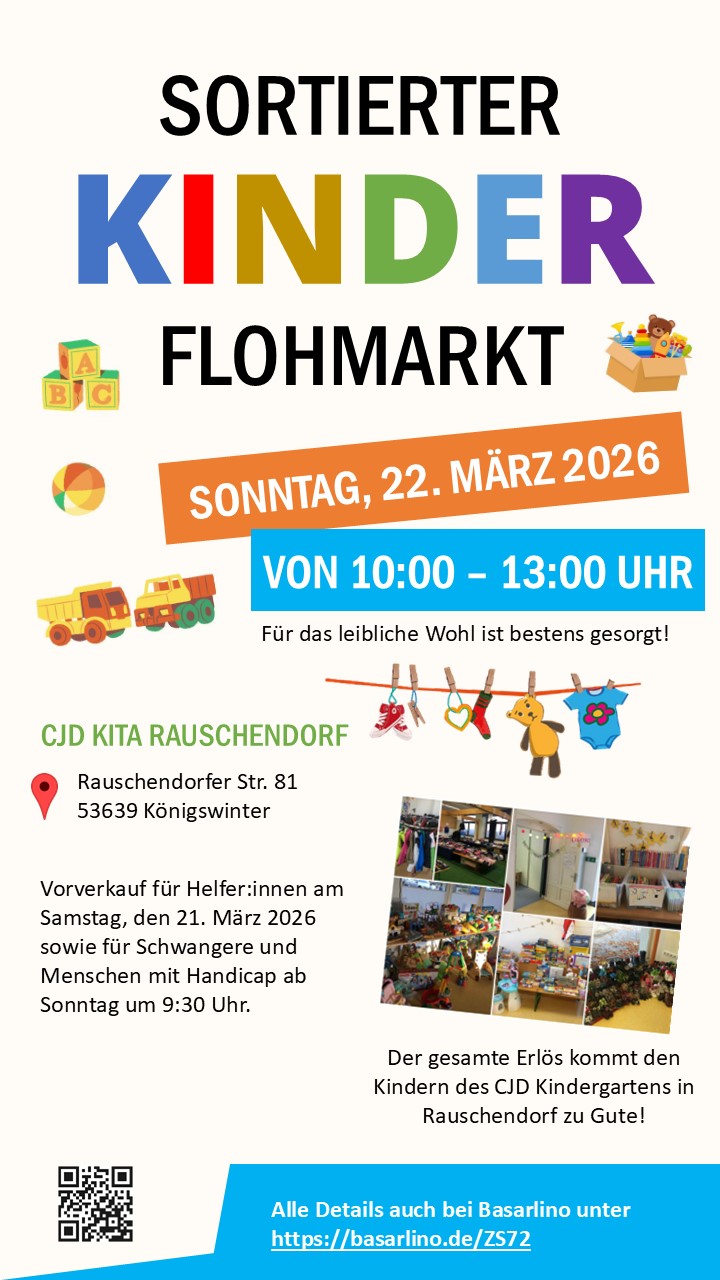 Der Förderverein Kindergarten mit Musik Rauschendorf e.V. organisiert zusammen mit dem CJD Kindergarten Rauschendorf einen sortierten Kindersachenflohmarkt für Übergangs- und Sommerbekleidung. Der Flohmarkt findet in den Räumlichkeiten des Kindergartens in Rauschendorf in der Rauschendorfer Straße 81 in 53639 Königswinter statt. Details findest du auch unter https://basarlino.de/ZS72