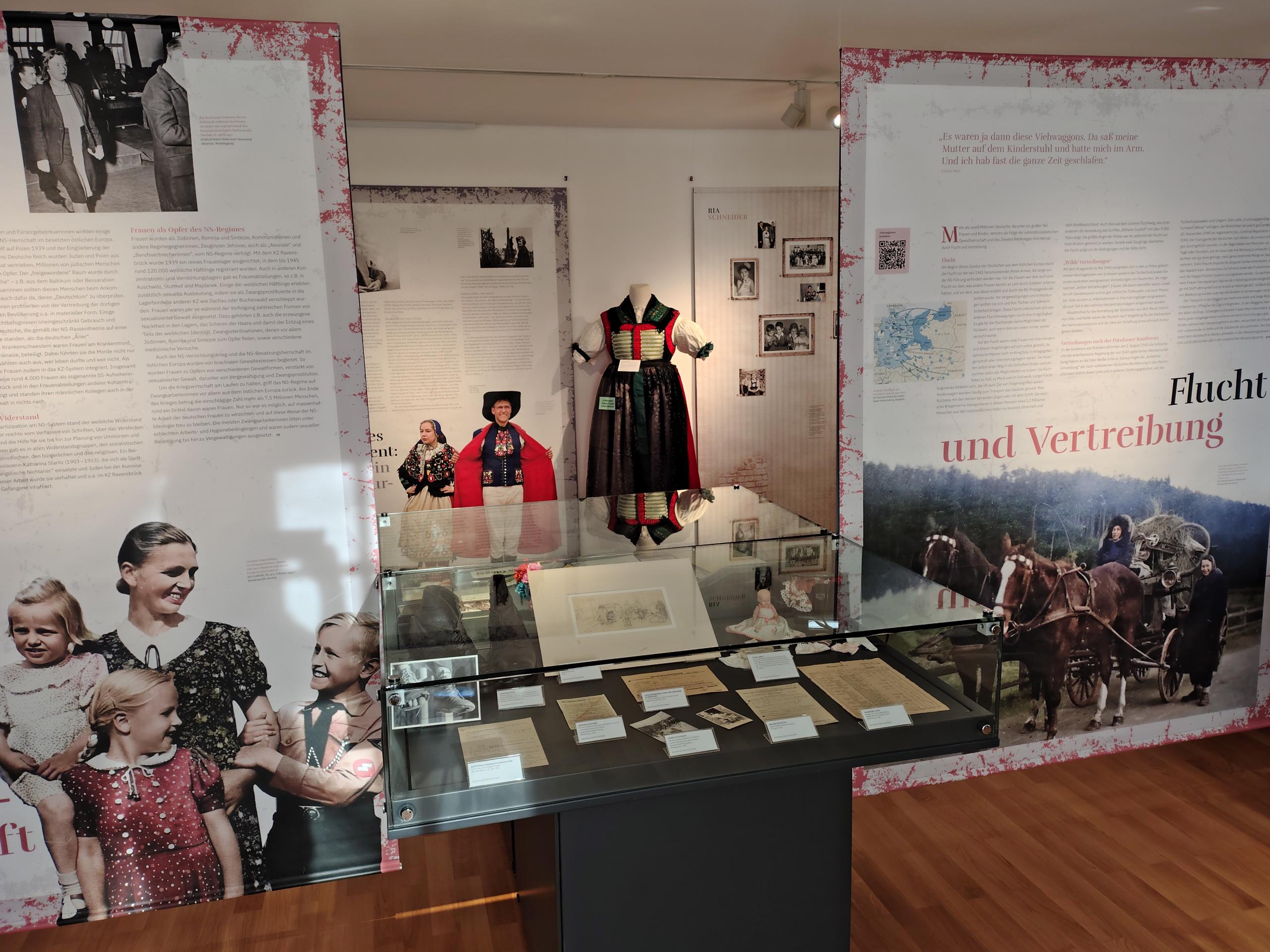 Die Ausstellung beschreibt Flucht, Vertreibung und Integration aus weiblicher Sicht. Sie öffnet den Blick für Erfahrungen und Herausforderungen, mit denen sich Frauen während und nach dem Zweiten Weltkrieg konfrontiert sahen. Im Mittelpunkt der Präsentation stehen individuelle Geschichten und Schicksale von Zeitzeuginnen, die aus unterschiedlichen Regionen stammen: Aus Ostpreußen, Pommern, Oberschlesien, Mähren und der Batschka. Die sechs Frauenbiografien werden in den Kontext der deutschen und europäischen Geschichte der Jahre 1933 bis 1945 gestellt. Die Gastausstellung aus dem Haus des Deutschen Ostens in München hat das Dokumentations- und Informationszentrum von HAUS SCHLESIEN um vielfältige Exponate zu schlesischen Frauenschicksalen aus der eigenen Sammlung ergänzt.